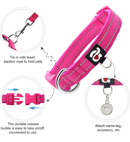 azuza Reflective Dog Collar , Soft Neoprene Padded Pet Collar with ID Tag Ring, Adjustable for Small Dogs,Hot Pink,S