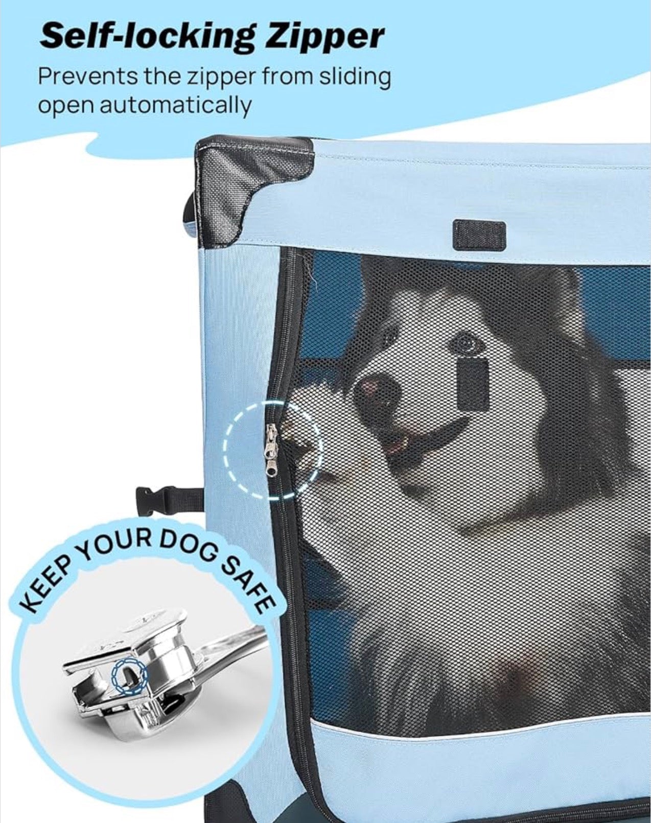 - 【Keep Safety】: This collapsible pet crate uses a fully structural fixed steel frame that can bear a load of 50 lbs (Fit for pets up to 55 lbs), which can maintain its shape and ensure durability. The crate has a built-in traction rope to enhance your pet's safety. The included straps can be tied to the back of the car's rear seat to secure the crate. An anti-skid pad on the corner prevents the crate from sliding in the car. The zipper pull has built-in anti-slip teeth, so the zipper stays in place and won't be opened by your pet's claws. Let you and your dog travel worry-free